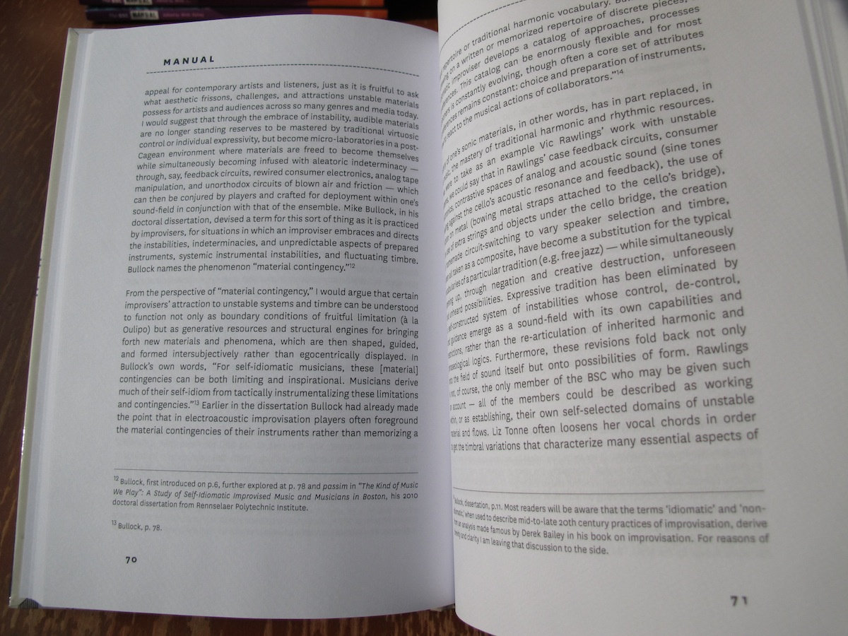 Manual is a combination full-length album and book focusing on the music and improvisational practice of the BSC, an eight-member electroacoustic ensemble formed by saxophonist and composer Bhob Rainey in 2000. More than just music with copious liner notes, Manual examines the process of improvisation from both within and outside the BSC, encountering topics ranging from genealogy to architecture, the boundaries of sense to the benefits of failure, flows of energy to bouts of guilt. The intersection and unfolding of ideas is often complex, but the writing in Manual is earthy and comprehensible, keeping jargon to a minimum without sacrificing the depth of the subject matter. Manual is not a monument to the BSC but rather an appreciation of improvisation from the perspective of an especially prolific community.